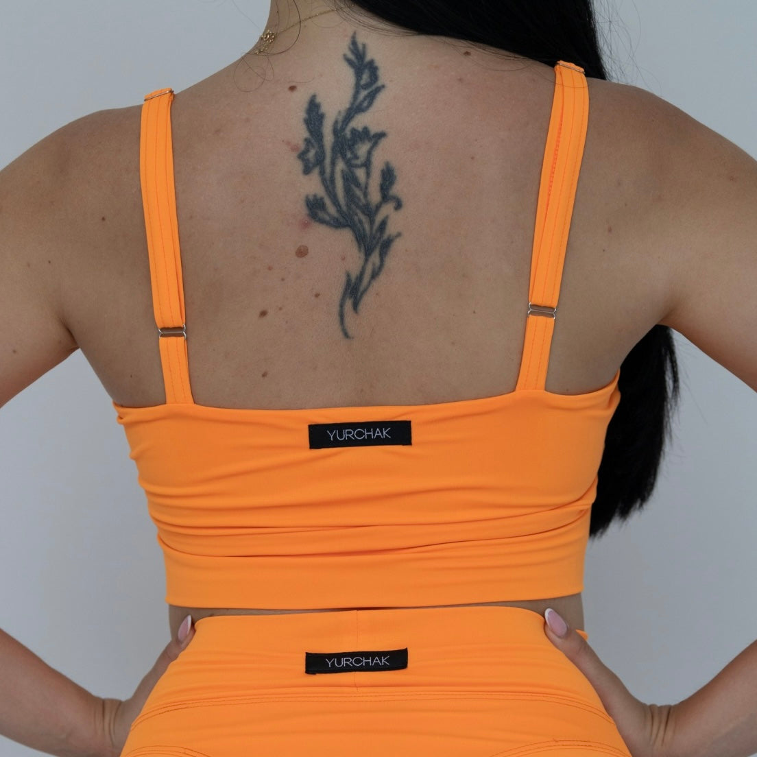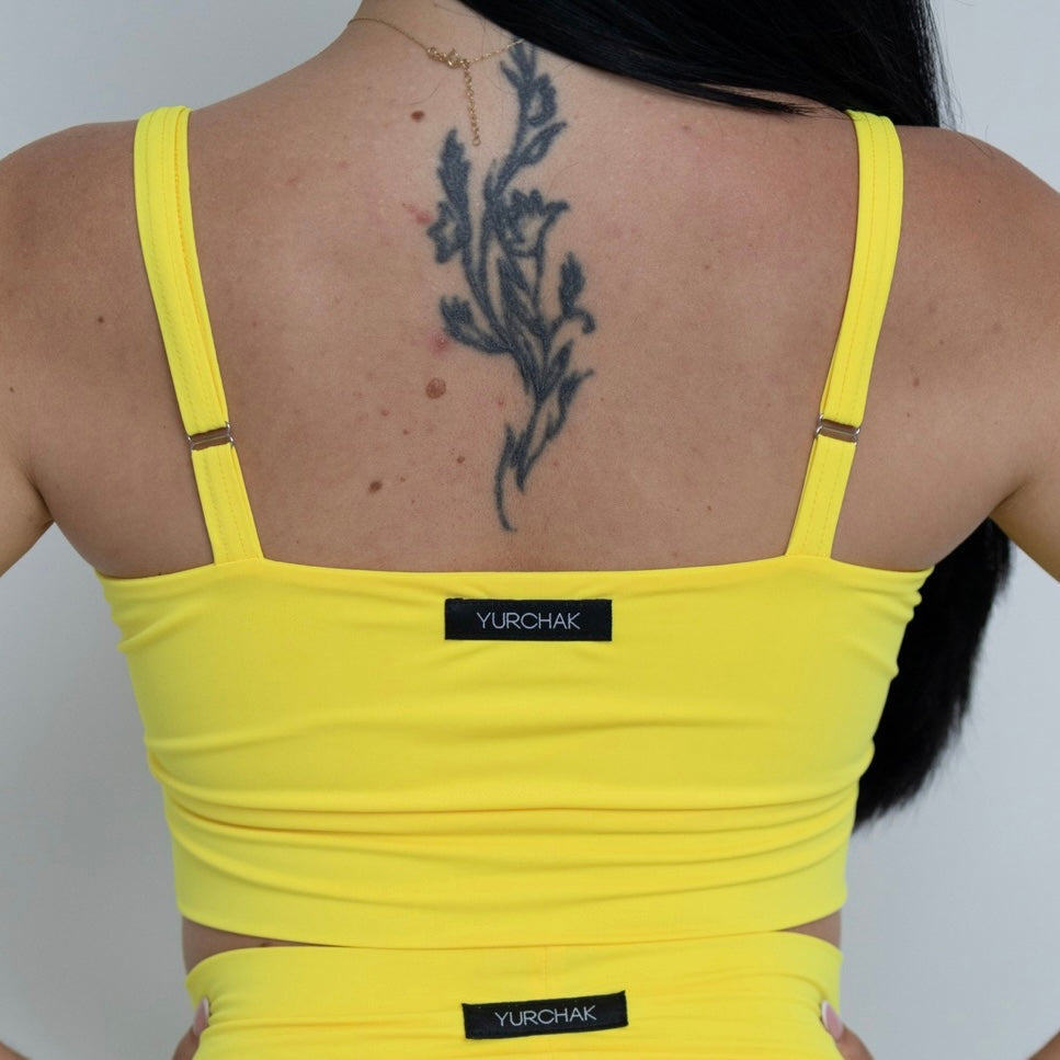 A bandeau-style crop top with supportive, adjustable straps and a unique underbust cutout.